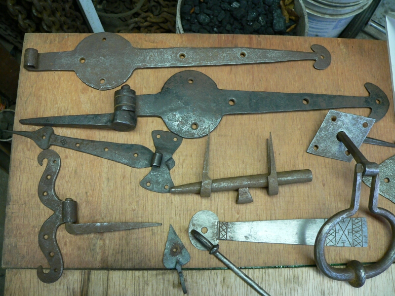 discussed some of the old hardware he has collected and some of the pieces he brought to show. He had one hinge still attached to a piece of the door showing how many times a large flat head rivet was used to hold the hinge to the door using the first hole in the hinge. This would hold the hinge securely to the door and the rest of the nails going through the hinge would hold the hinge straight and hold the door together.