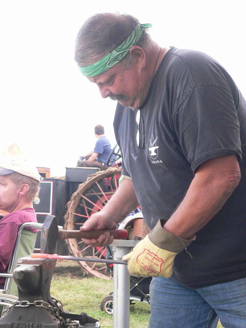started a fire, and started forging. Mike Erdie forged and sold a bunch of heart hooks and got some of the young people in the crowd to help crank the blower and do a little forging. Mitch Swirsky was our interrupter, explaining to the onlookers what we were doing, and forged a few leafs. A member of the group that runs the show came with some broken pieces off of an antique baler and asked if we could forge some new pieces for him.